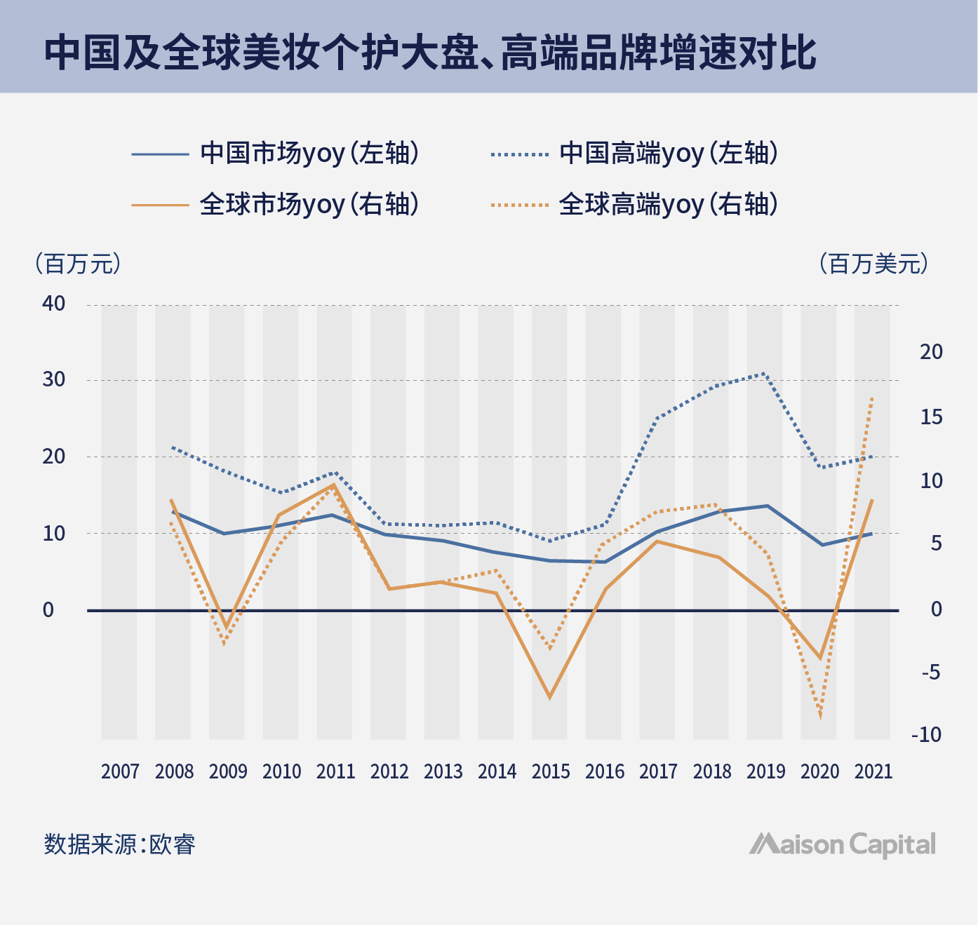 如下图所示,即便把目光聚焦于中国本土的美妆个护市场,高端品牌的同比增长依然跑赢了行业大盘。