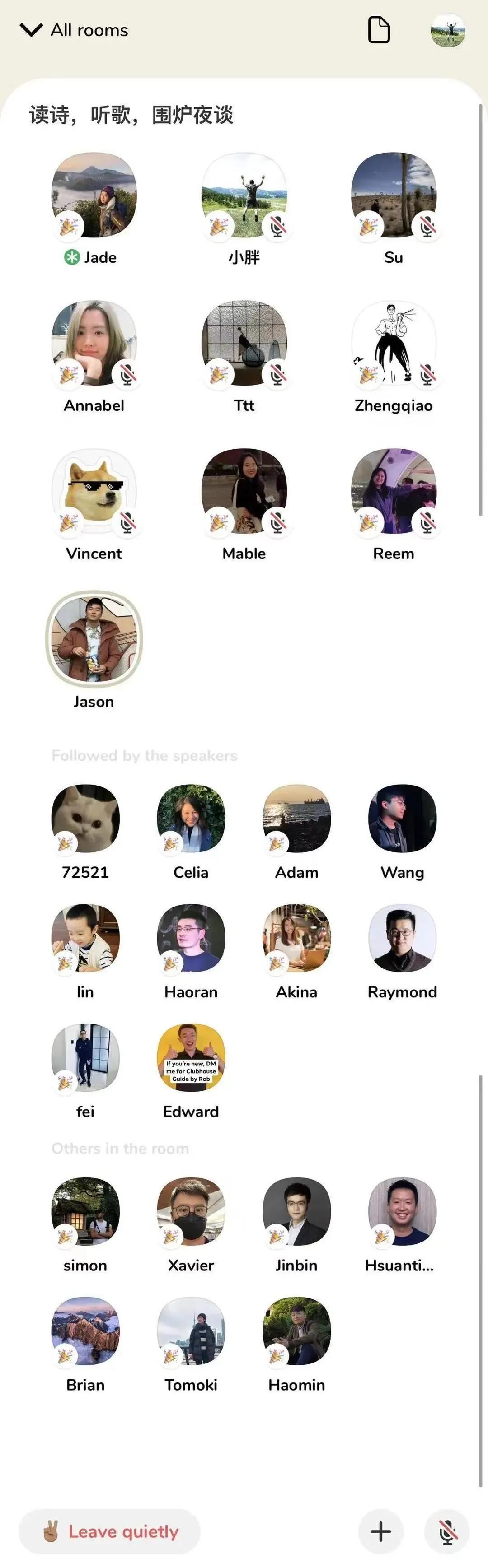 首先,CH 没有任何文字或弹幕功能,连“拍一拍”都没有。如果你是一位听众,在一场讨论中有了自己的表达欲,比如对某个演讲者的话十分赞同,那么你只能通过张开嘴说话来表达,没有任何其他形式。我认为这恰恰促进了适当的参与感,否则很容易变成经常冷场的独角戏,尤其在亚洲国家的东方文化中。而由于没有摄像头和视频功能,会大大降低参与者的物理和心理门槛,你甚至可以一边在饭馆吃饭一边放在旁边听,偶尔说话。